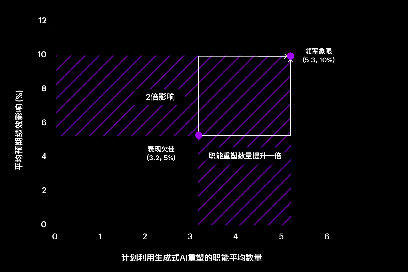 埃森哲研究表明,拥有行业领先数字核心(数字核心指数排名前25%)的企业,其利用生成式AI重塑的职能数量,以及有望创造的价值皆为其他企业的2倍。早期采用生成式AI的企业在项目规模和范围方面受益良多。