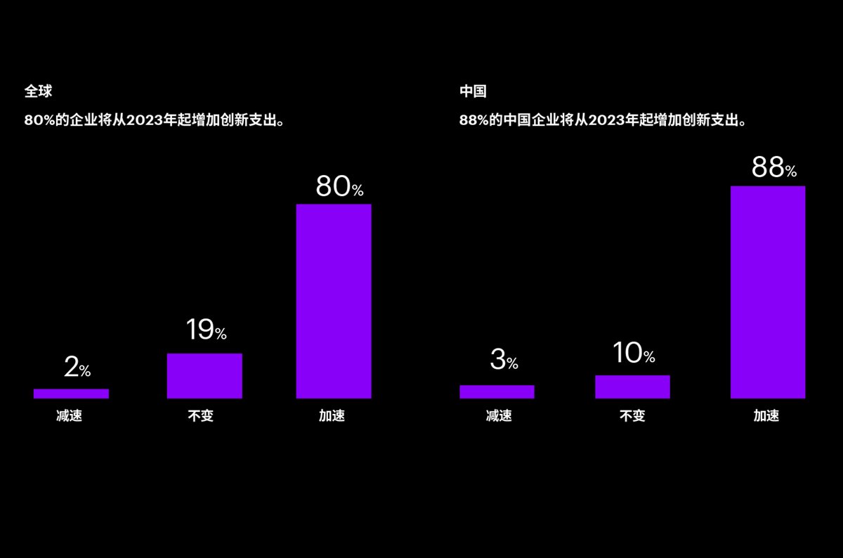的全球企业和更多的中国企业(88%)可能会在2023年后将其创新预算增加到之前的两倍。