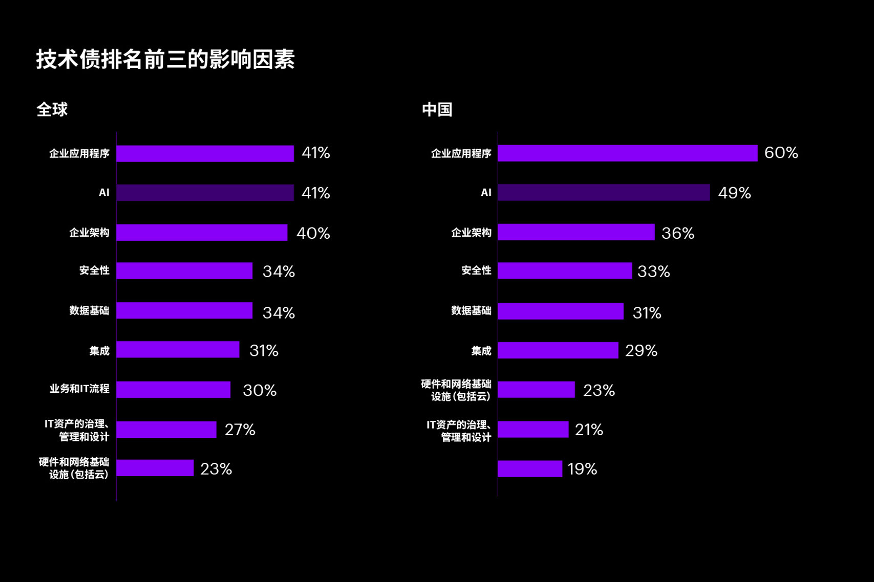 企业应采用生成式AI和其他技术来维护稳健的IT系统。但同时埃森哲研究也发现,AI和应用程序并列成为全球技术债的主要来源,而在中国,应用程序是技术债的最主要来源。